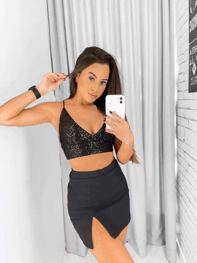 DESCRIÇÃO: Top de paetê bordado, alças finas e decote frontal.